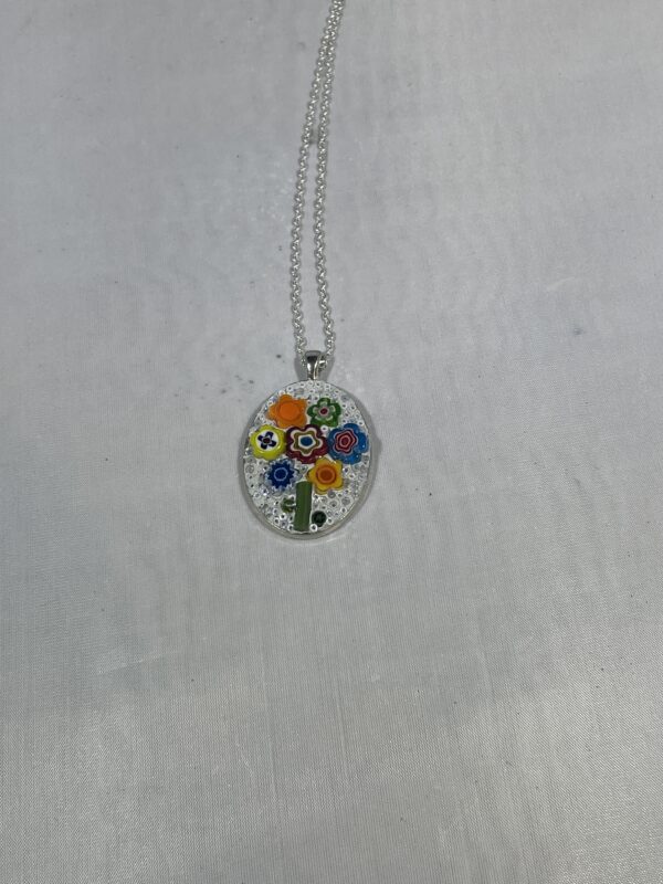 Micro mosaic jewelry is made with glass beads, glass cabochons, glass filati and tiny scrap mosaic glass. I occasionally use some porcelain flowers as well. Necklaces make great gifts and come on 18”-22” chains.